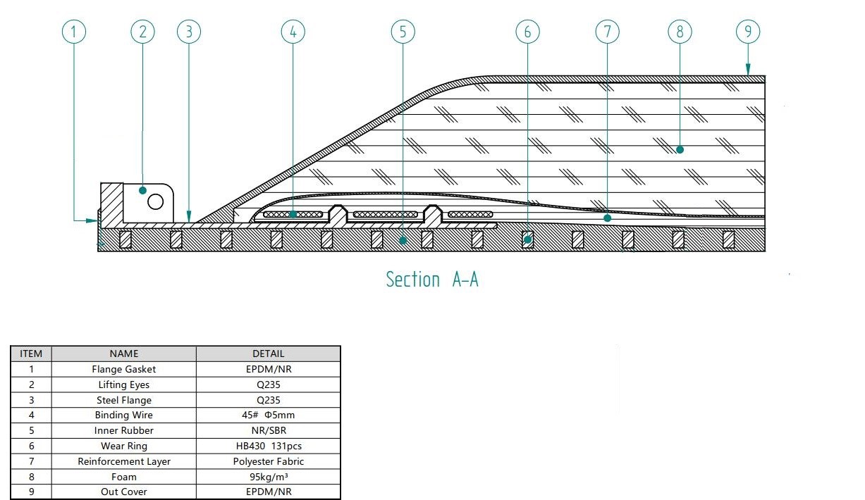 An Armored Floating Hose is composed of lining, wear-resistant steel rings, reinforcing piles, flotation jacket, outer cover and hose fittings at both ends.